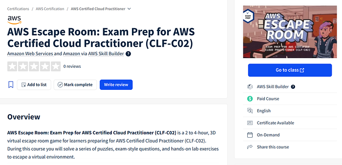 3. AWS Escape Room: Exam Prep for AWS Certified Cloud Practitioner (CLF-C02) (AWS Skill Builder — Paid Free Trial)