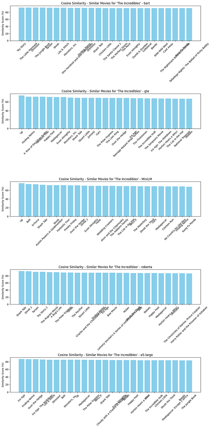 ‘Similarity Score (%)’: [round(most_similar_movie_median_bart[1] * 100, 3), round(most_similar_movie_median_gte[1] * 100, 3), round(most_similar_movie_median_MiniLM[1] * 100, 3), round(most_similar_movie_median_roberta[1] * 100, 3), round(most_similar_movie_median_e5_large[1] * 100, 3)]