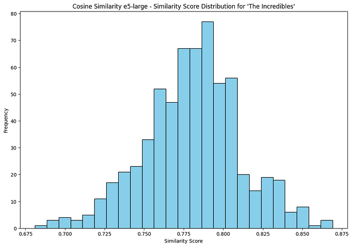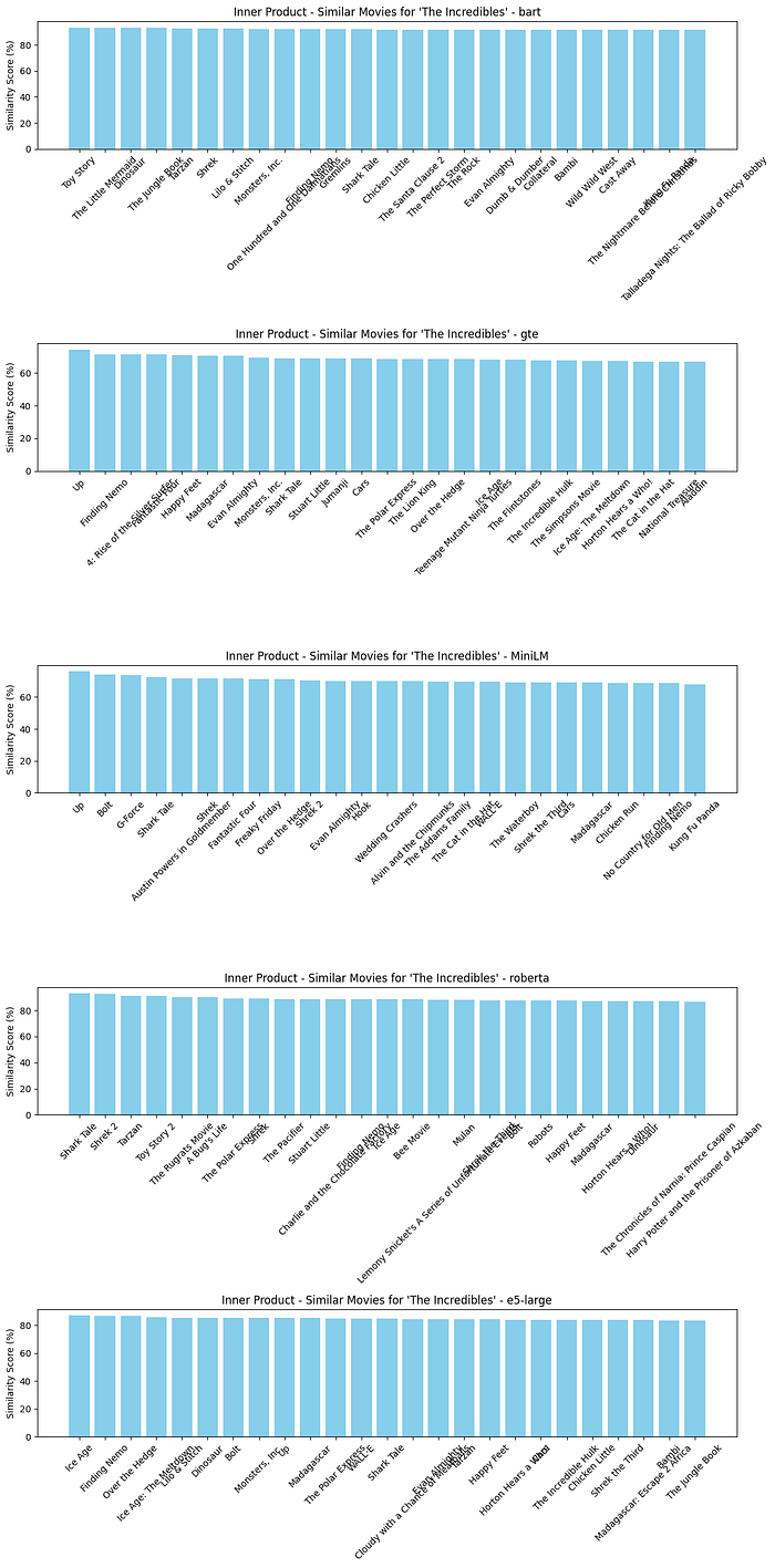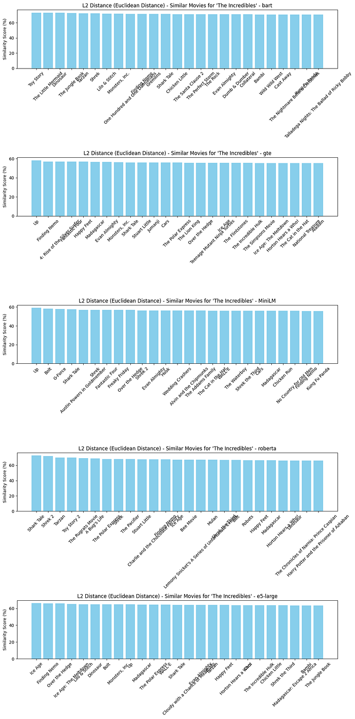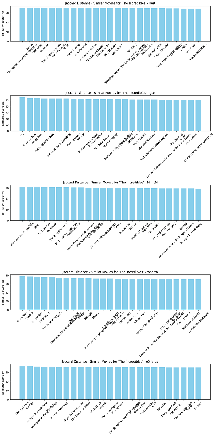 similar_movies_e5_large = find_similar_movies_sql(query_movie_title, threshold=0, return_n=631, distance_function=’<=>’, embedding_type=‘e5_large’)